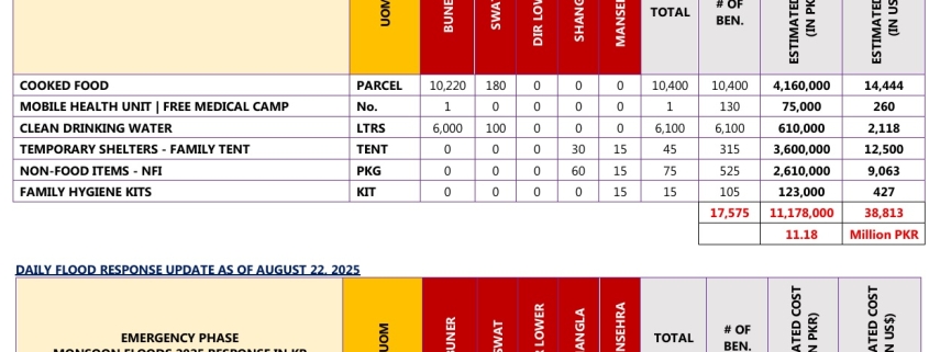 On the 22nd of August alone, PRCS KP reached 3,230 beneficiaries, with relief support valued at PKR 1.32 million (USD 4,566). The day’s operations included: