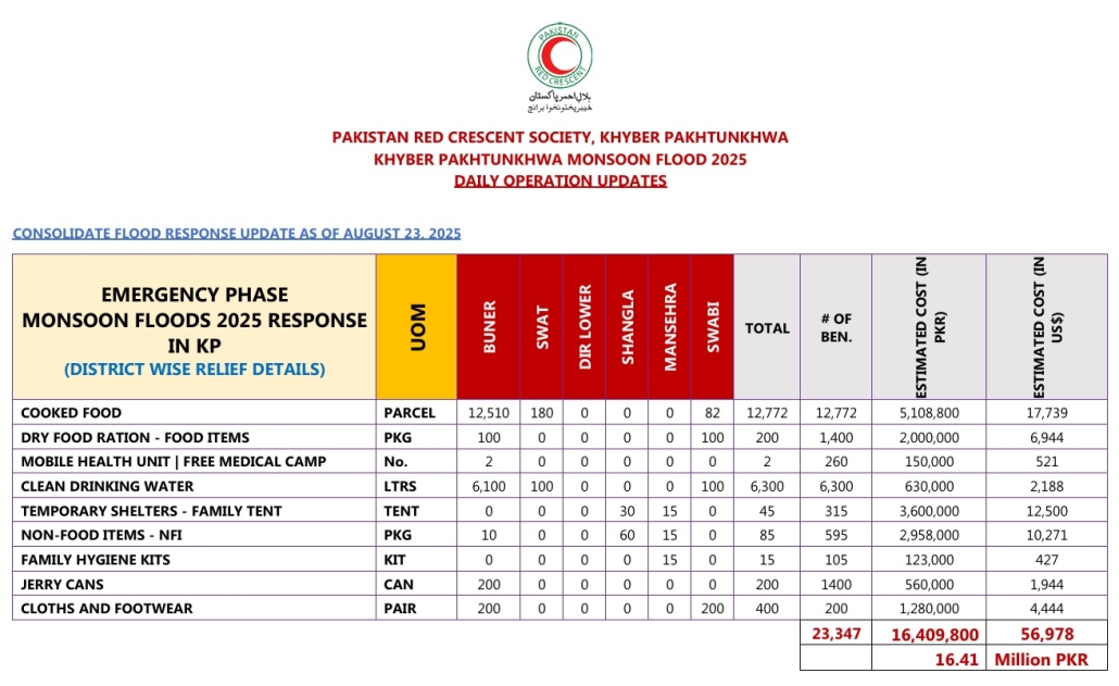 PRCS KP has reached more than 23,300 beneficiaries across flood-affected districts including Buner, Swat, Dir Lower, Shangla, Mansehra, and Swabi, with total relief assistance valued at PKR 16.41 million (USD 56,978).