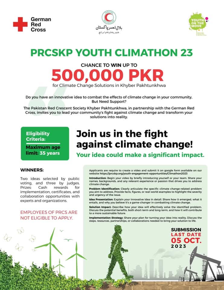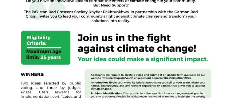 The Pakistan Red Crescent Society Khyber Pakhtunkhwa (PRCS KP) is excited to announce an opportunity for young, motivated individuals from across the province to participate in Climathon 2023, a global initiative aimed at tackling the challenges of climate change through innovative ideas and actionable solutions.